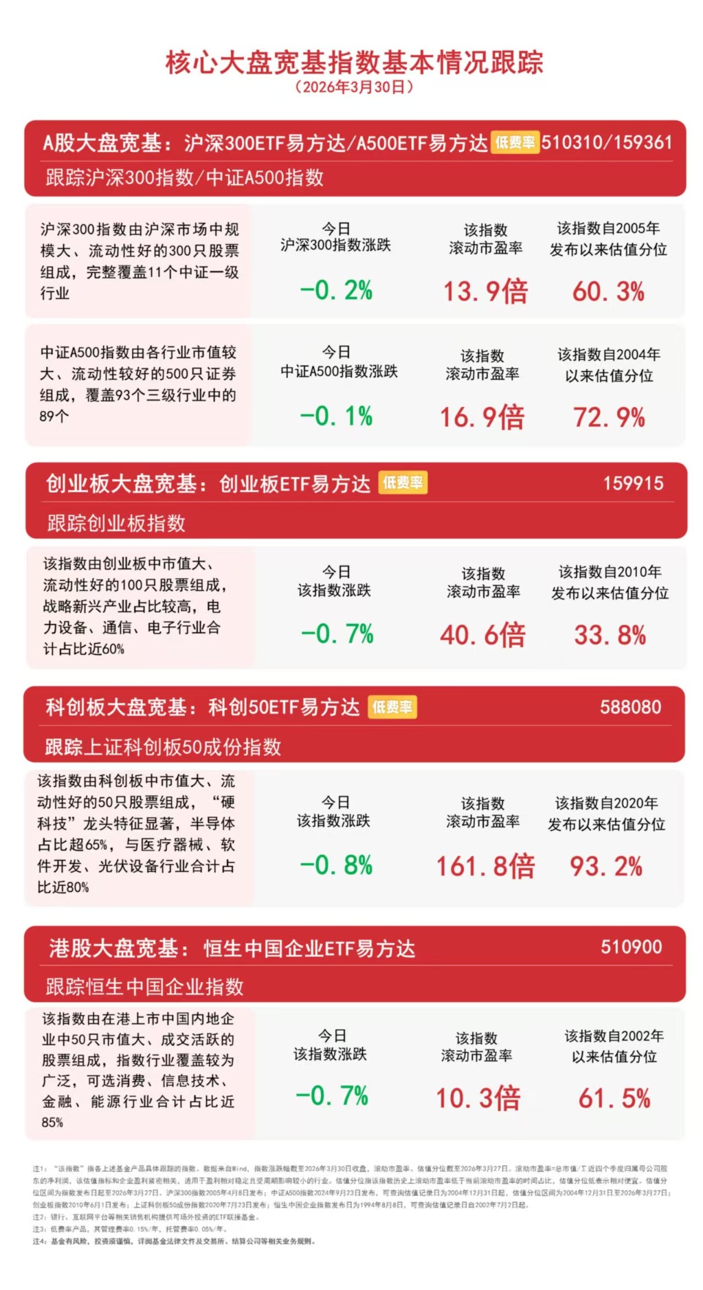 截至收盘,中证A500指数下跌0.1%,沪深300指数下跌0.2%,创业板指数下跌0.7%,上证科创板50成份指数下跌0.8%,恒生中国企业指数下跌0.7%。